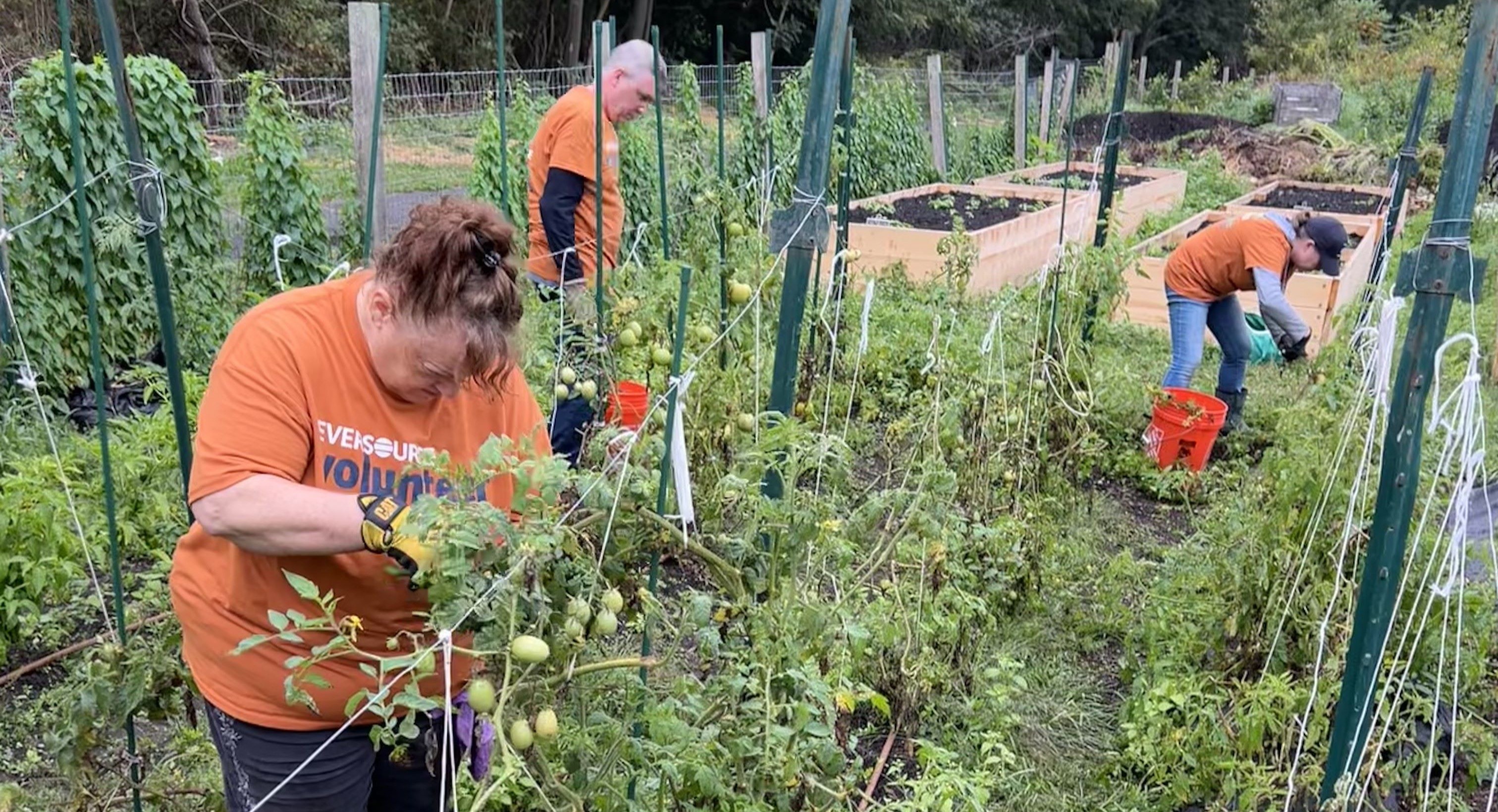 Employees help harvest over 220 pounds of produce for local food pantries, and clear vines and weeds for the next planting season at the Groundwork Lawrence Costello Farm in Massachusetts.