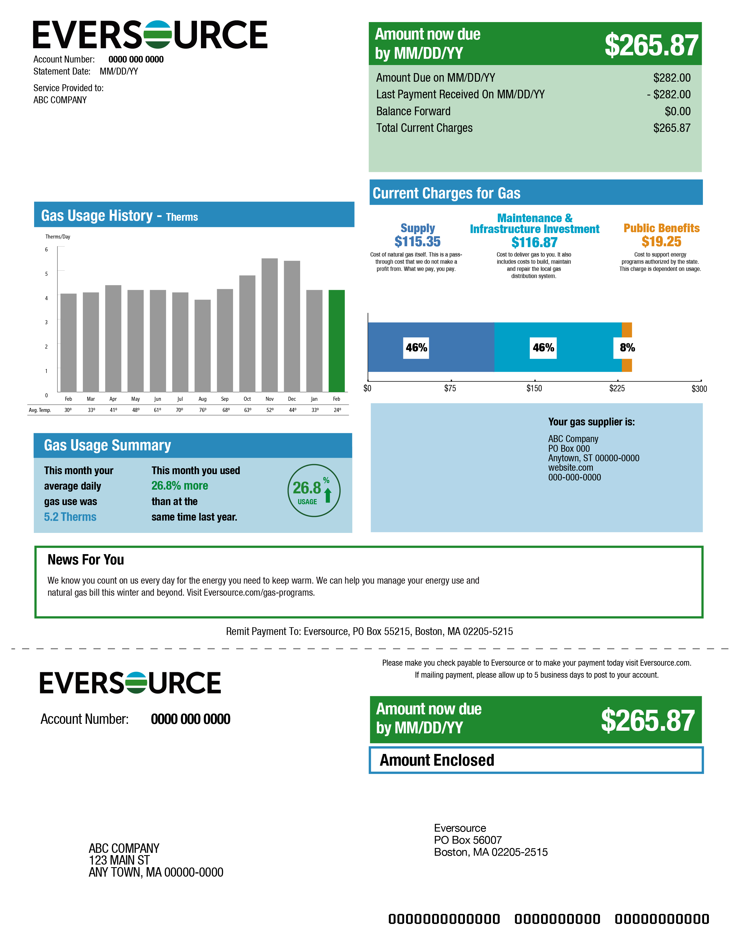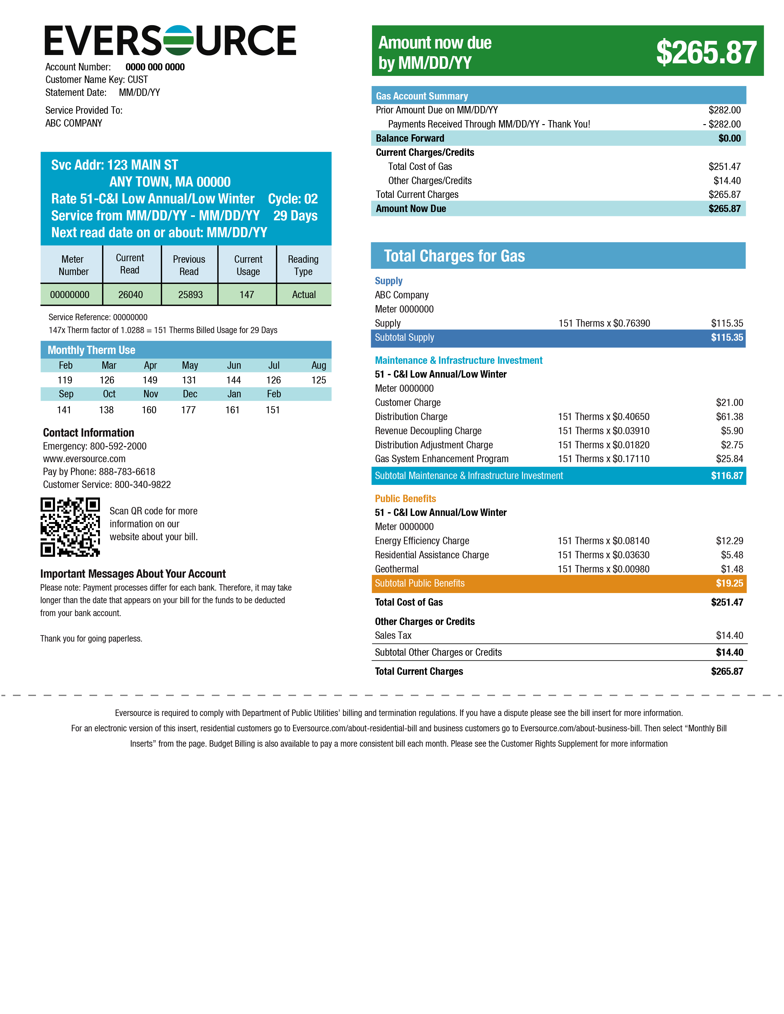 - Total Charges for Gas: This list breaks down the line items that make up Supply, Maintenance and Infrastructure Investment, and Public Benefits charges.
