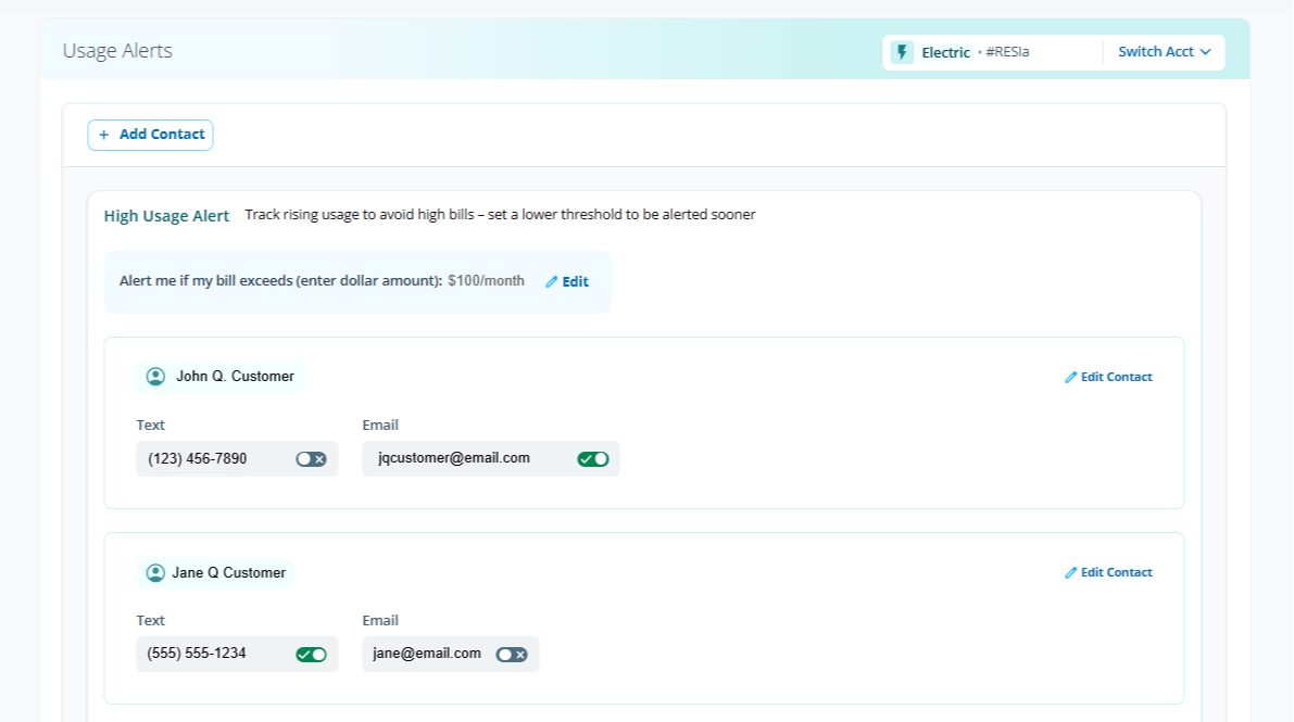 With the Usage Alerts page, available only through the website, you can add, edit and delete contact information as well as enable and disable whether or not you receive these alerts.